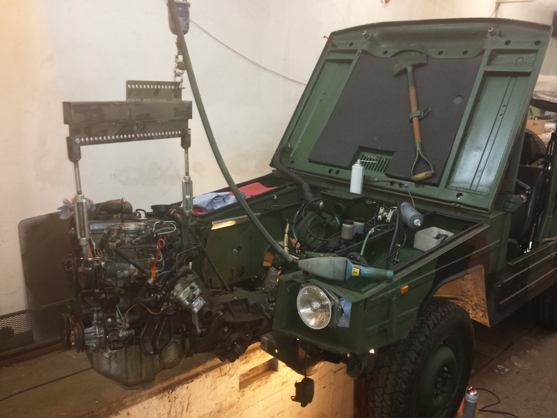 Eine komplette Motor-, und Getriebeeinheit wartete aber schon auf ihren neuen Einsatz im Iltis. Im Getriebe ist der 3. und 4. Gang länger übersetzt, das machte uns doch neugierig und wir starteten am 27.12.2014 mit der Operation, alter Motor und Getriebe per Demag Portalkran entfernen und für die neue Kombination vorbereiten.